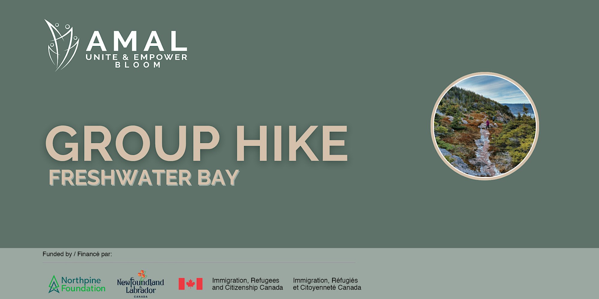 Join us for a scenic Freshwater Bay hike!Join us for an unforgettable afternoon exploring the history and beauty of Freshwater Bay, a hidden gem along the East Coast Trail. Once home to a thriving fishing community with summer homes, stages, and even a chapel, the bay now offers a quiet escape where traces of its past mingle with rugged coastal charm.We’ll set out on a 5 km out-and-back hike (moderate difficulty, approx. 1 hr 45 min) via Dead Man’s Path from Blackhead Road, arriving at the bay for time to relax, share food and conversation, explore the shoreline, or simply sit and enjoy the scenery. Keep your eyes open for seabirds—and perhaps even whales passing by.Details:📅 Date & Time: Saturday, October 19th, 1:30 pm–5 pm🚶♀️ Distance: 5 km round-trip (2.5 km each way)⛰ Trail Difficulty: Moderate👥 Max Participants: 20🔞 Age Restriction: 12+📍 Meeting Point: Parking Lot – Blackhead Road (Park in the lot provided, on the ocean side of the road, opposite Blackhead Crescent)🚗 Optional Ride Share: 7 Rickets Road (1 pm)Why Join?Physical Benefits:Improve cardiovascular healthBuild strength, endurance, and balanceMental & Emotional Boost:Reduce stress and anxietyEnhance mood and focusIncrease confidence through accomplishmentSocial Perks:Connect with fellow nature loversFoster community and friendshipShare a positive, supportive group experienceWhat to Bring:Comfortable hiking footwearWarm layer (it can be breezy!)Rain jacket (just in case)SunscreenReusable water bottleYour favorite snacks for sharingBloom – A Free Wellness and Community Integration Initative for Newcomers in Newfoundland and LabradorBloom supports your well-being, connection, and meaningful integration at any stage of your journey as you build your new life here.Brought to you by Amal Unite & Empower, with generous support from IRCC, the North Pine Foundation, and JIG (Department of Job, Immigration & Growth)🔔 Important: One-Time Participant Form (Required)To help us continue offering free wellness activities to the community, we ask all participants to complete a short one-time information form.This is a requirement from our funders and helps us keep Bloom running at no cost to you. The information is confidential and used only for reporting and planning.👉 Please fill out the form before attending an activity:https://qx0bg.share.hsforms.com/2QkdtyUk1Rnq6VA5_MEBIZgIf the form isn’t completed in advance, you may not be able to participate—so thank you for taking a moment to support this important step.📸 Photography & Video Notice:Photos or videos may be taken during Bloom events to help promote our programming. By attending, you consent to this use. If you’d prefer not to be photographed, please let a staff member know when you arrive.Feel free to reach out to us at [email protected] for more information or any inquiries you may have.